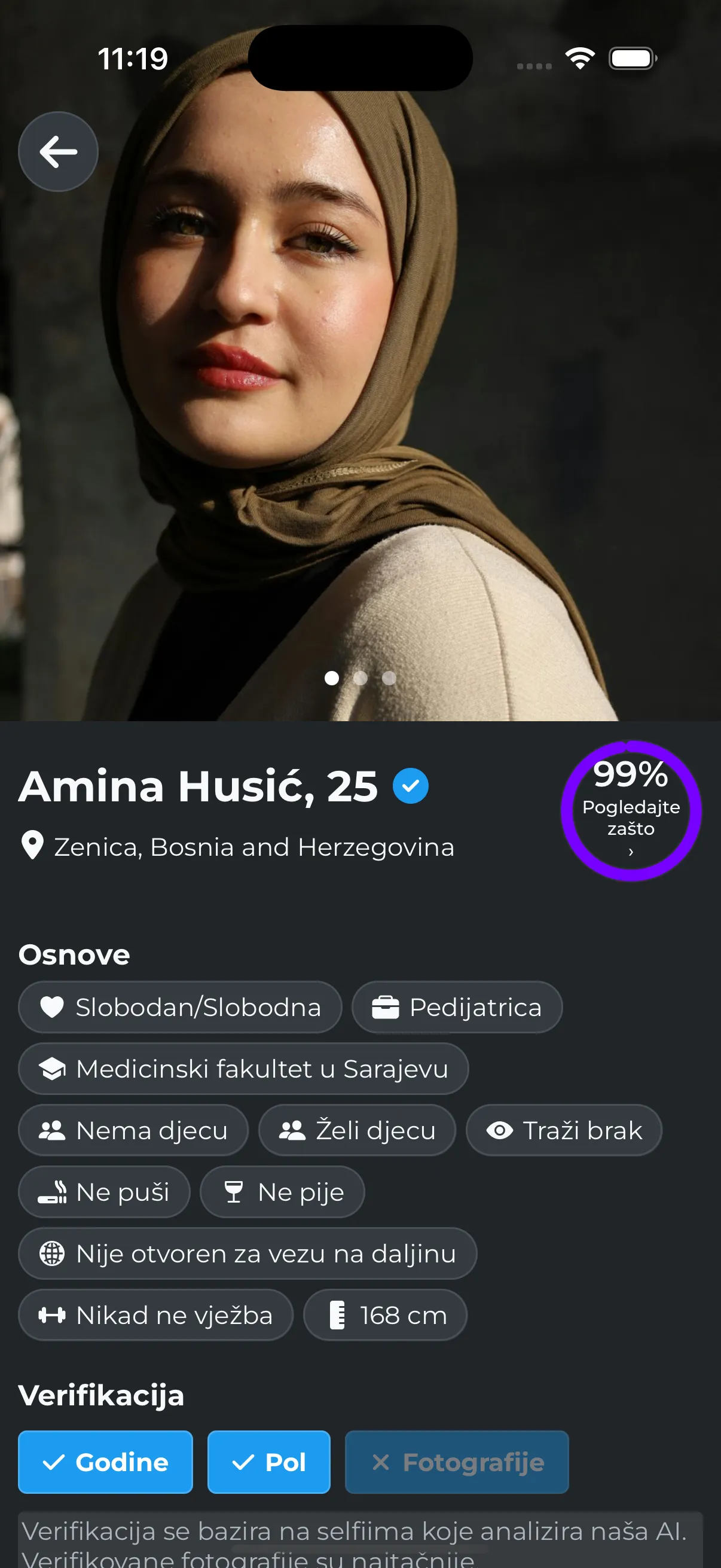 "Bila sam skeptična prema dating aplikacijama, ali ova je posebna za muslimane! Takodje pristup sa pitanjima je super i fokusiran na ono što je bitno – vjera, stavovi, porodica, kultura i budućnost. Ja sam imala sreće da pronadjem sadašnjeg muža, sa kim sam imala poklapanje od 89%. Javila sam mu se i dopisivanje je bilo iskreno i bez pritiska. Sada smo u već u braku – hvala Habibi Marriage što povezuje ljude sa sličnim vrijednostima iz našeg regiona!"